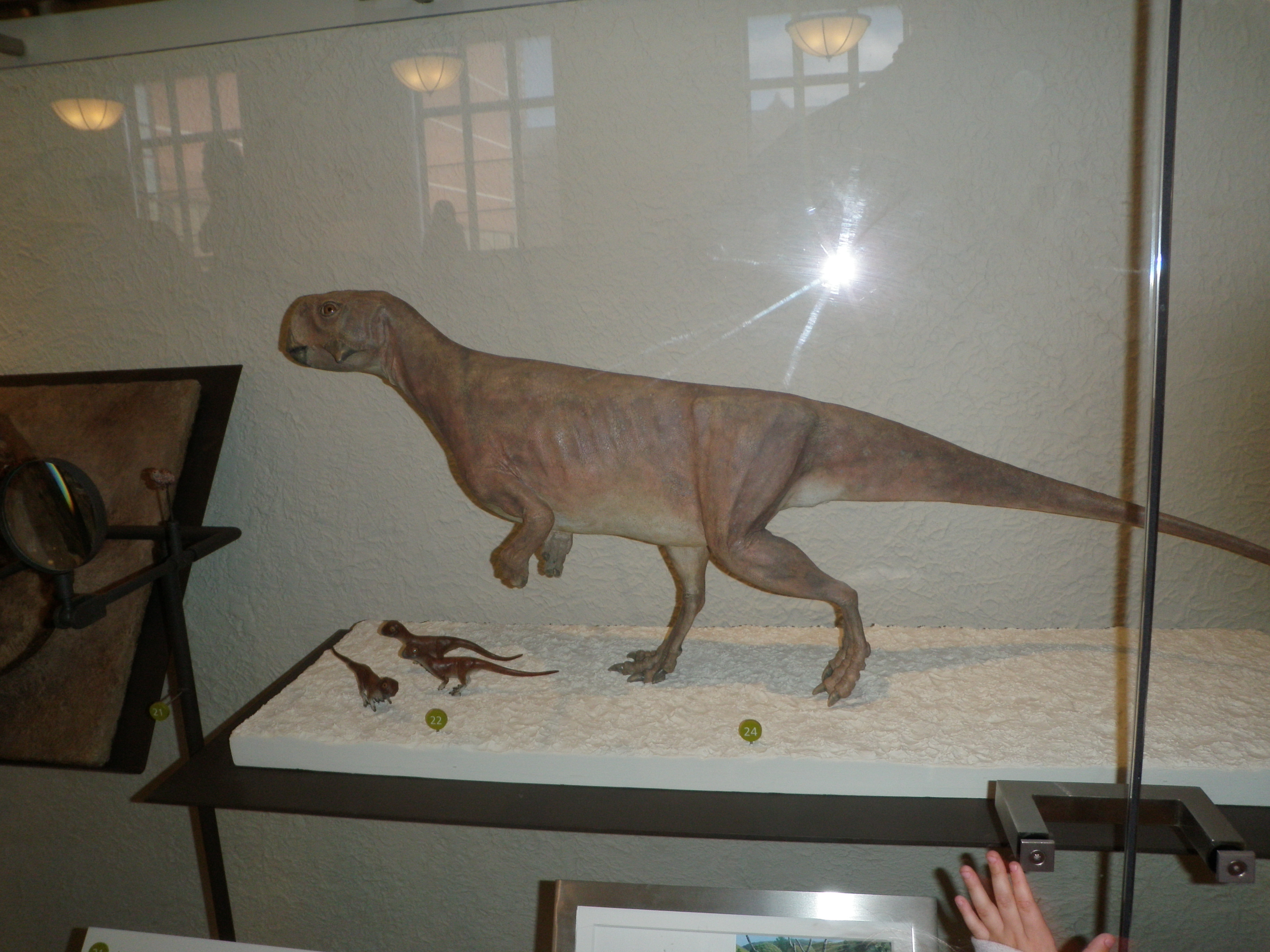 While I was gawking (and taking awkward pictures) with the rest of the tourists, I noticed a tiny dinosaur in a glass case off to the side. It was roughly the size of a dog, and pictured protecting a few baby dinosaurs. It immediately caught my imagination, and I snapped a picture. This picture actually.